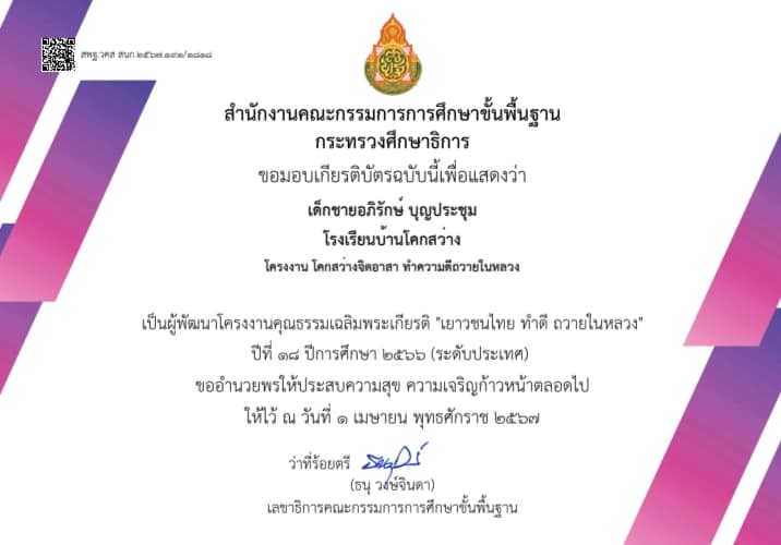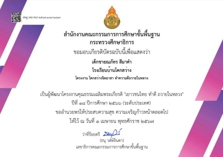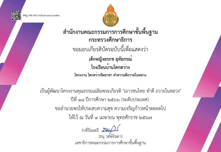 เป็นผู้พัฒนาโครงงานคุณธรรมเฉลิมพระเกียรติ "เขนไทย ทำดี ทาดี ถวายในหลวง" ปีที่ ๑๘ ปีการศึกษา ๒๕๖๖๖ (ระดับประเทศ)