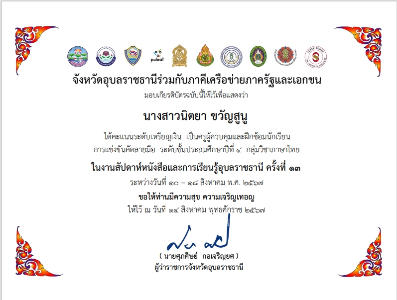 เกียรติบัตร ครูผู้ควบคุมและฝึกซ้อมนักเรียน การแข่งขันคัดลายมือ ระดับชั้นประถมศึกษาปีที่ 4 กลุ่มวิชาษาไทย ในงานสัปดาห์หนังสือและการเรียนรู้อุบลราชธานี ครั้งที่ ๑๓ |
